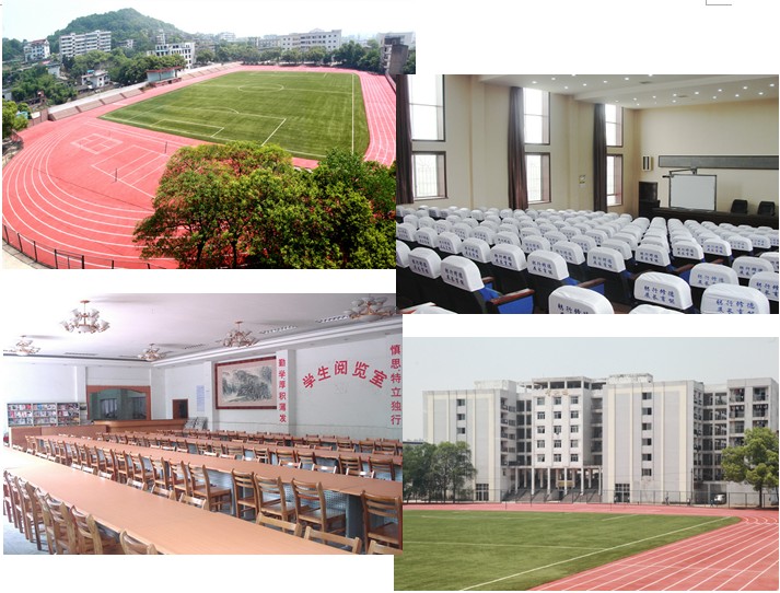 有64间标准教室的三幢教学楼,有一幢设施较为完备的理化生实验楼,有7.4万册藏书的师生阅览室,有近2000个床位的高标准学生公寓,有投资达150万的校园网,有独立的学校网站,有人工草坪标准足球场及4×400米环型塑胶跑道和较完备的各种体育设施。